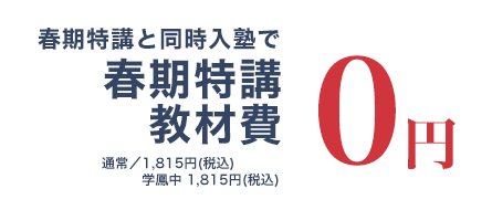 | 新中2・3生 | 50分×2コマ×4日間 ■教科:5教科(国・数・英・理・社) ■受講料:¥0 ※別途教材費:¥1,815(税込)⇒同時に入塾で¥0 |