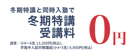 | 小4~6生※郡山駅前校・郡山北校・福島駅西口校・会津校・いわき校の小4生は実施しません。 | 50分×2コマ×4日間 ■教科:2教科(国・算) ■受講料 ¥13,200(税込)⇒同時に入塾で¥0 ※別途教材費:¥2,420(税込) |
